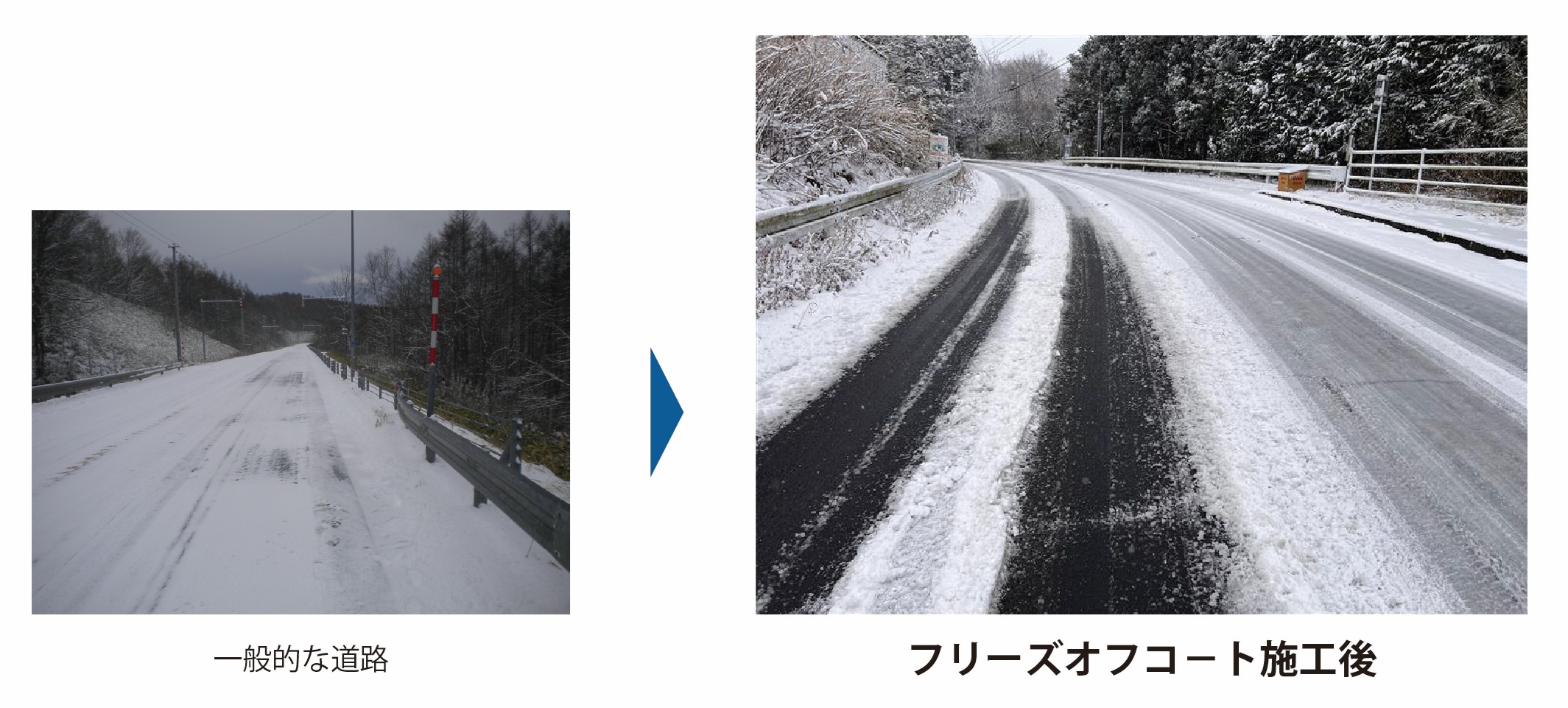 - 凍結防止剤散布無しでも効果発揮するため、初雪や仲春など予期せぬ降雪予報の際、凍結防止剤の事前散布判断に迷う必要がありません。