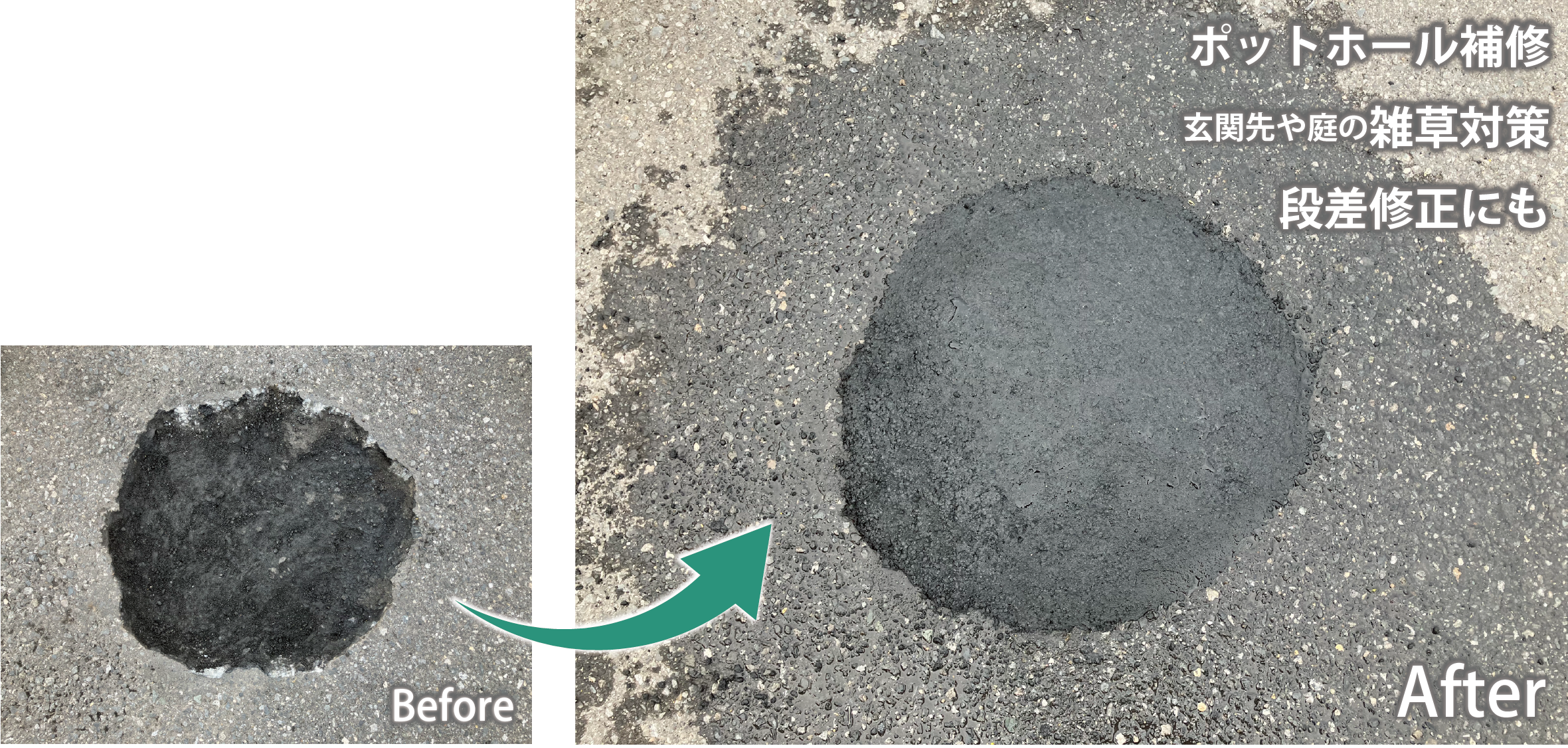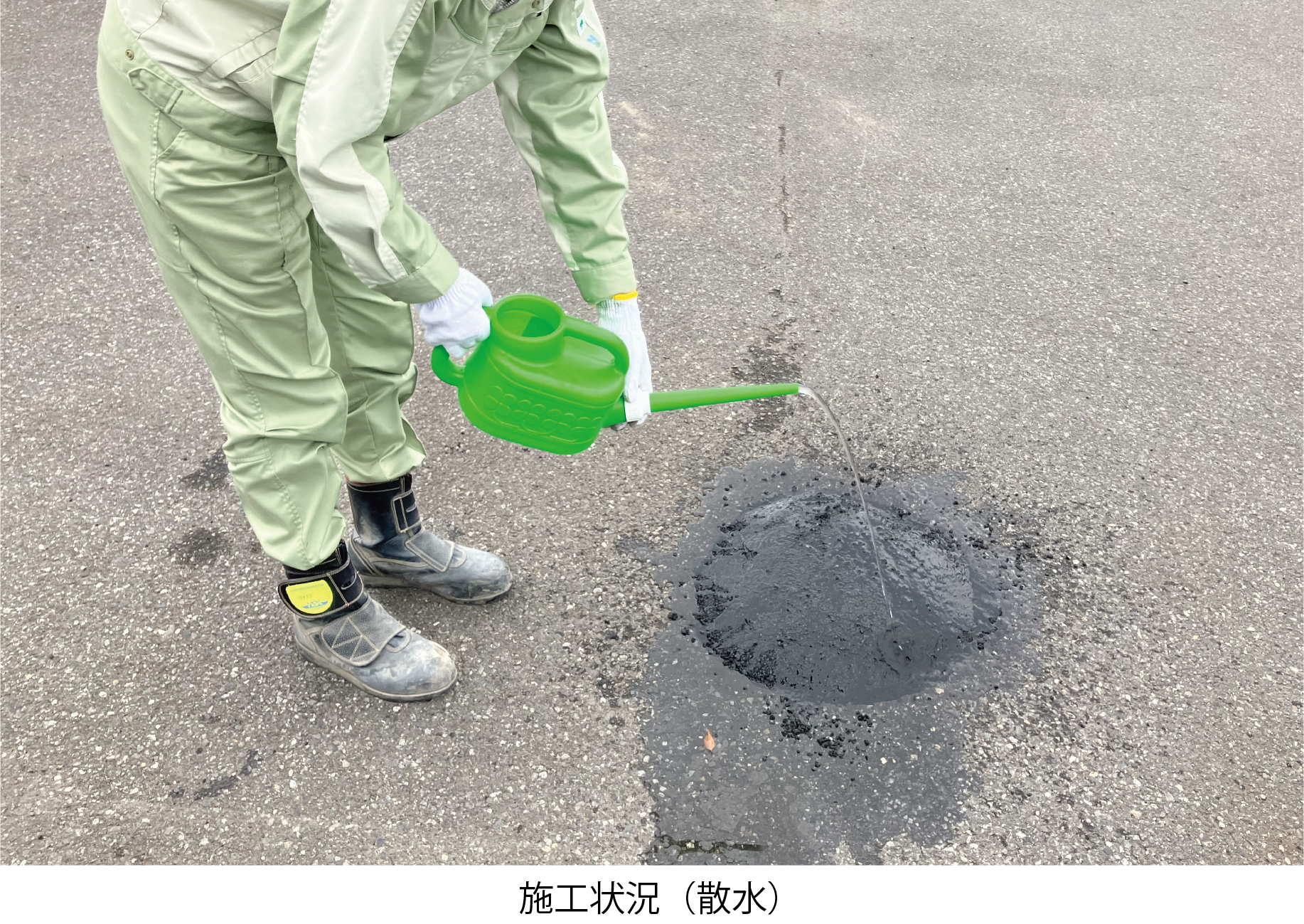 - 従来の常温アスファルト混合物(揮発硬化タイプ)と比べて耐久性が非常に高く、速く固まります。